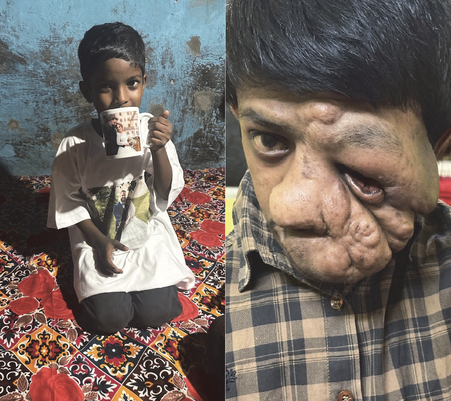 Auf dem re. Bild seht ihr unseren Freund Abishek .Wir haben für ihn alles menschenmögliche getan. Leider kann man ihm, trotz mehrerer Operationen, infolge seiner Plexiformneurofibromatosa medizinisch nicht helfen. Er kann mittlerweile nur noch wenige Minuten sitzen. Sein Zustand ist stabil auf sehr tiefem Niveau.