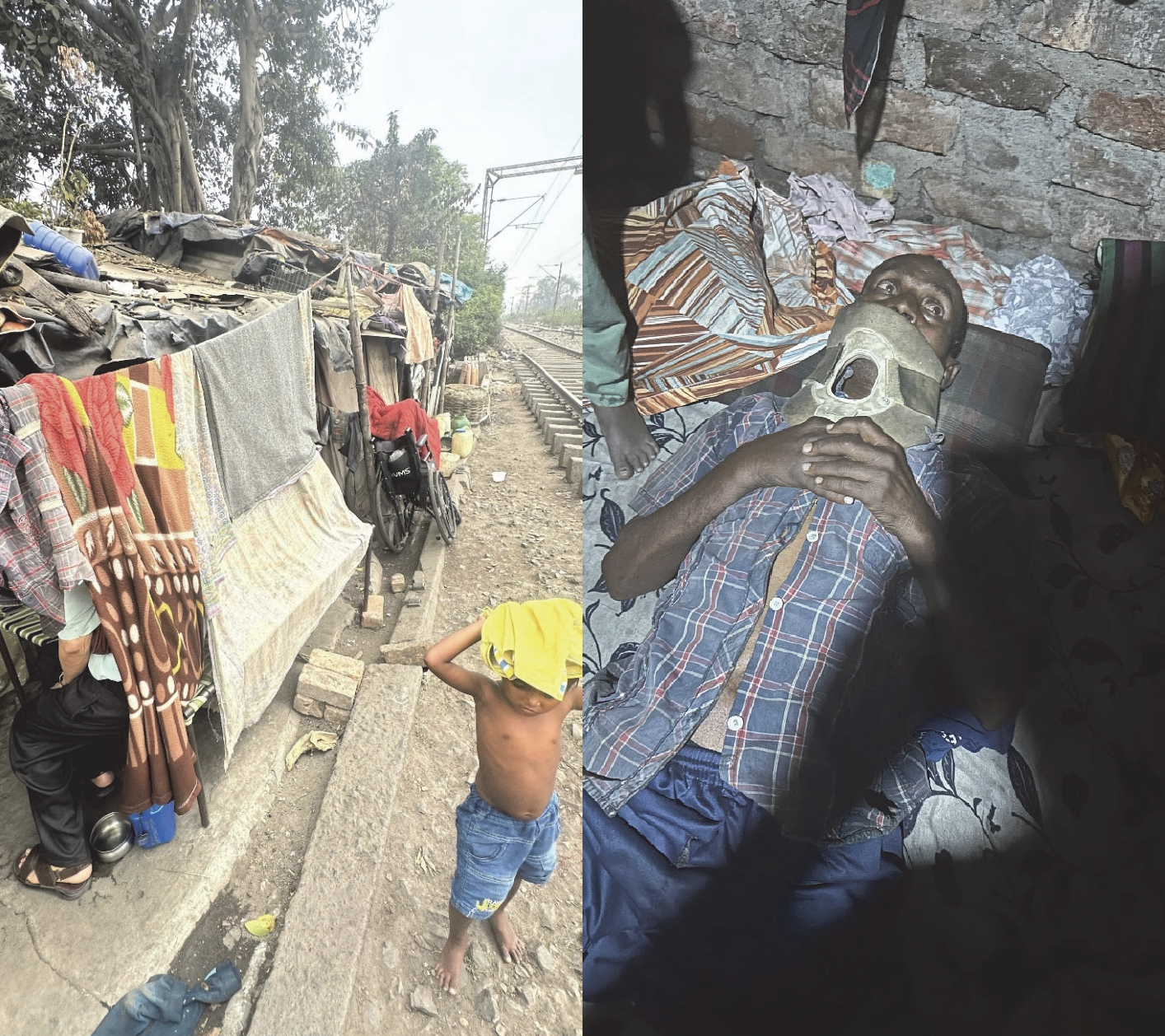Die Kinder unserer Schule leben alle in Slumhütten aus Lehm, Blech, Unrat und verschiedenen Abfällen oder in einem dieser völlig verwahrlosten Hochhäuser. Auf dem Bild re. unten könnt Ihr einen Familienvater sehen, der nach einer Halswirbelfraktur so daliegt. Auch hier haben wir viel unternommen, ihm zu helfen. Es geht ihm wieder besser, da er – Gott sei Dank – einen stabilen Bruch hatte.